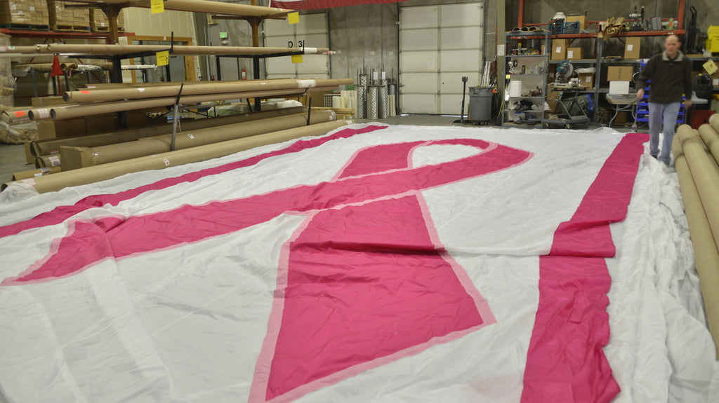 Colonial Flag produced this large, custom Breast Cancer Awareness flag in 2015, for a car dealership in Alabama. Applique techniques were used to create this huge flag.