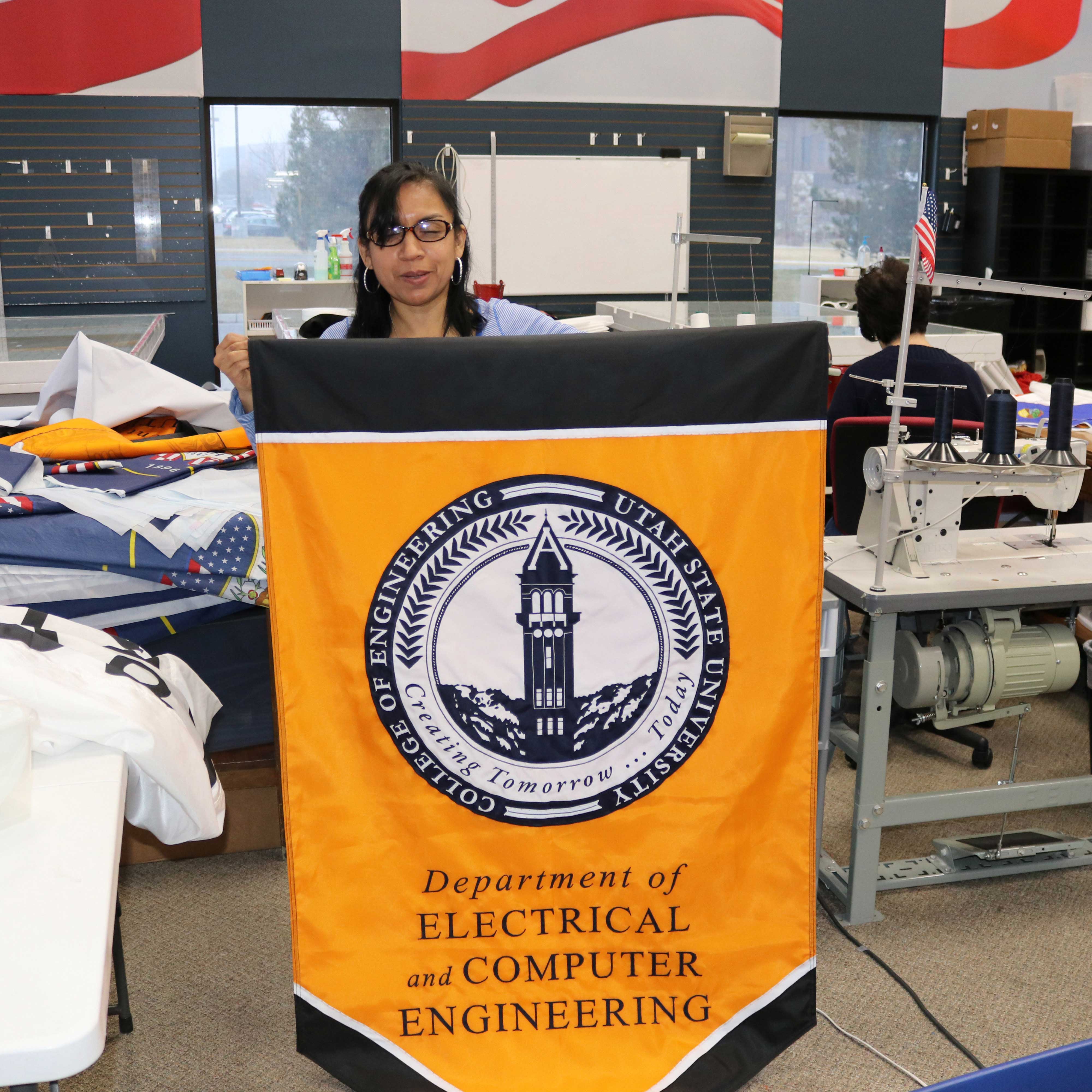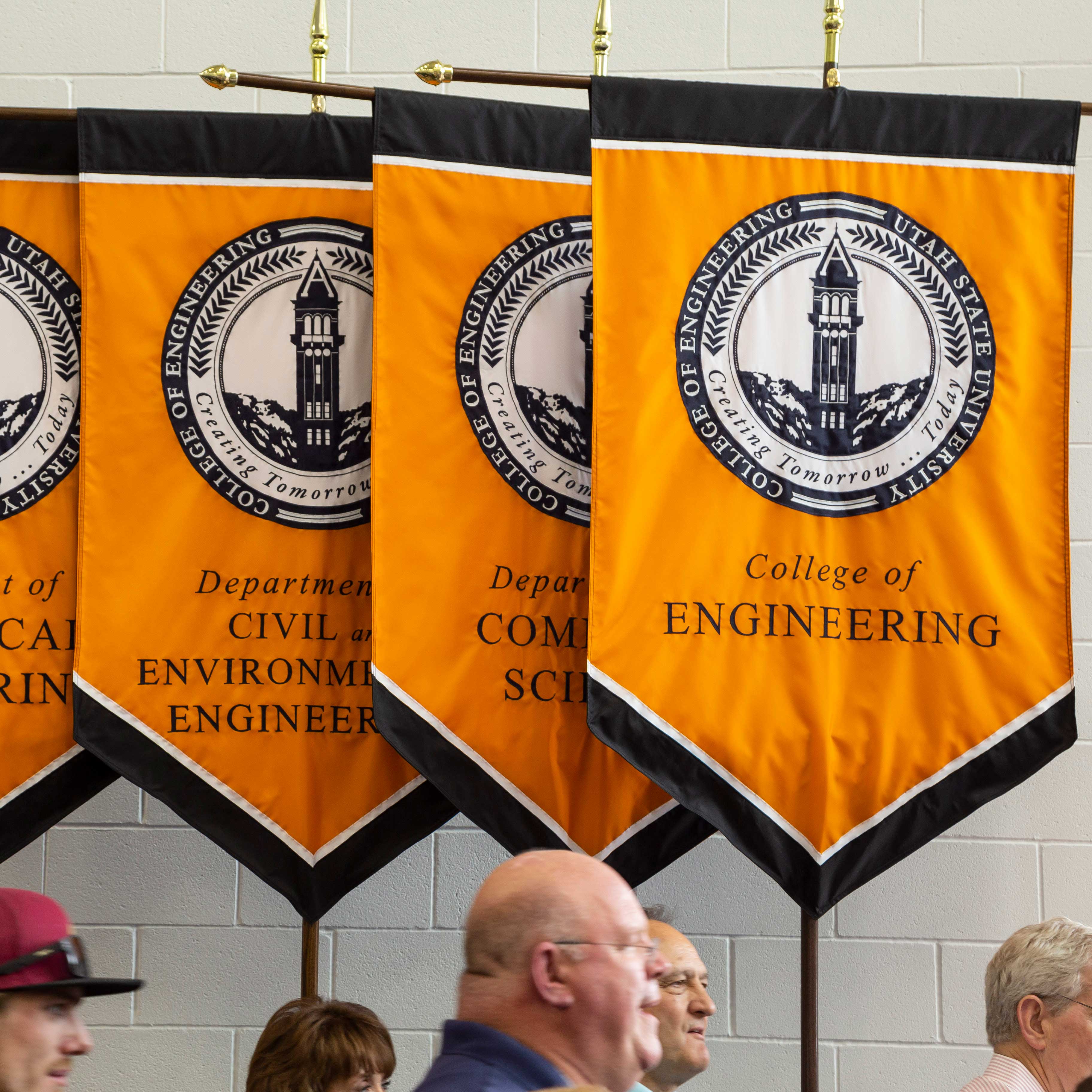 Colonial Flag produced these custom complex applique gonfalon banners for the Utah State University in 2018. These were displayed during the graduation ceremonies for the College of Engineering.