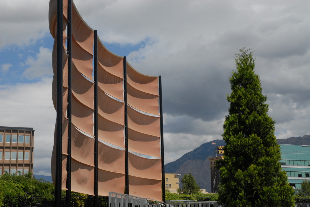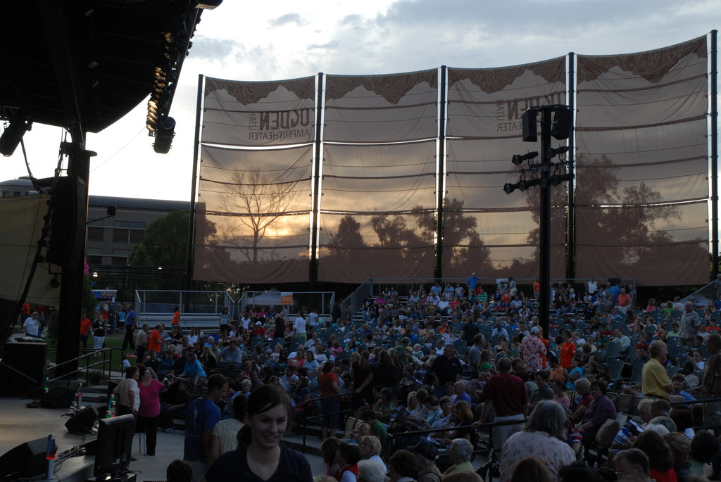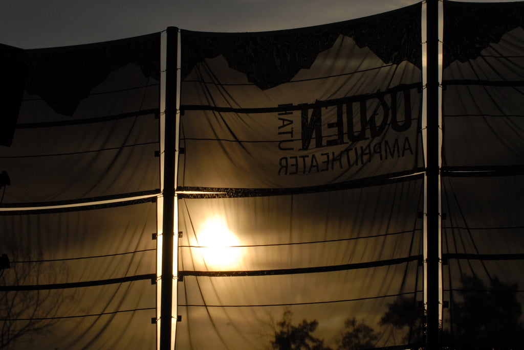 Colonial Flag manufactured and installed both the sturdy poles and heavy fabric sun shade panels that make up this structure. These sun shades effectively block the sun during performances at the venue.
